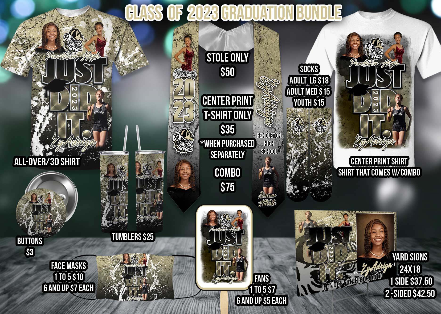 Options to choose from include our stylish All-Over 3D Shirt, classic Center Print T-Shirt, attention-grabbing Yard Sign, cozy Custom Socks, Custom Tumbler, trendy Pin Buttons, elegant Custom Stole, cool Graduation Hand Fans, and Face Masks. ππππ